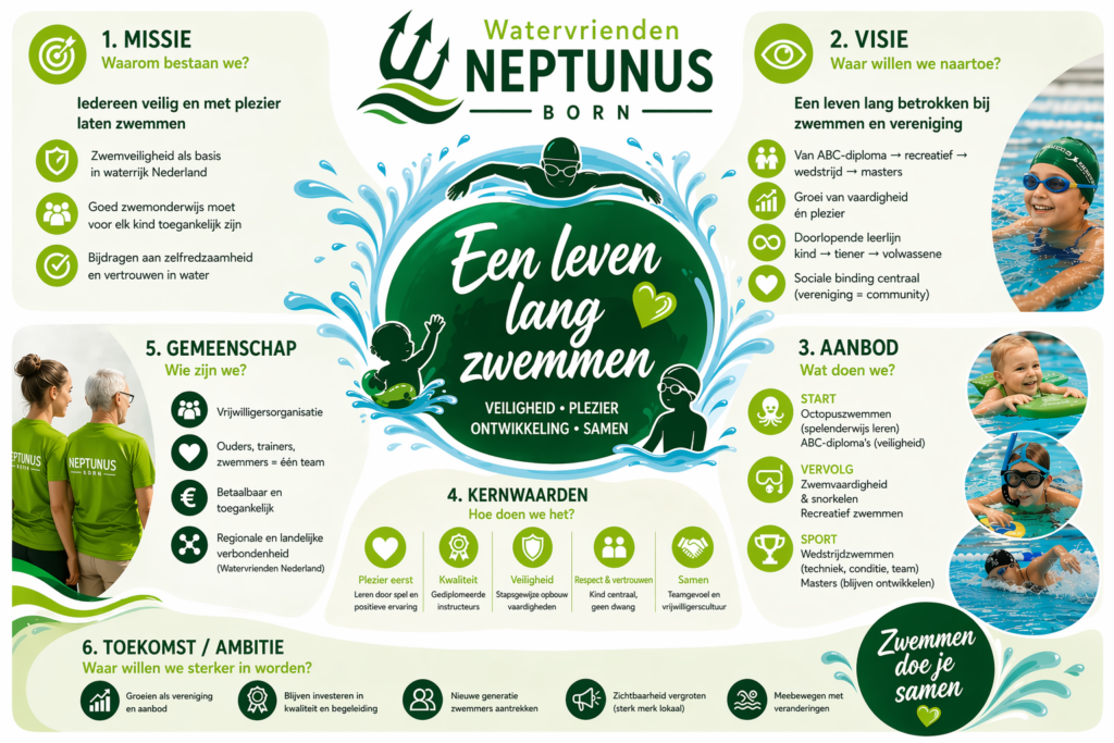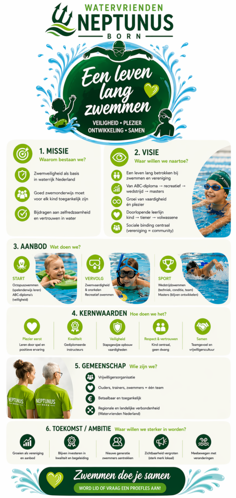 Waarom zwemmen bij Neptunus? Alles wat we doen, doen we samen. Onze vereniging draait volledig op de inzet van enthousiaste vrijwilligers. Dat zie je niet alleen terug in de persoonlijke aandacht, maar ook in de portemonnee: wij bieden kwalitatieve zwemlessen en activiteiten aan tegen een voordelig tarief.